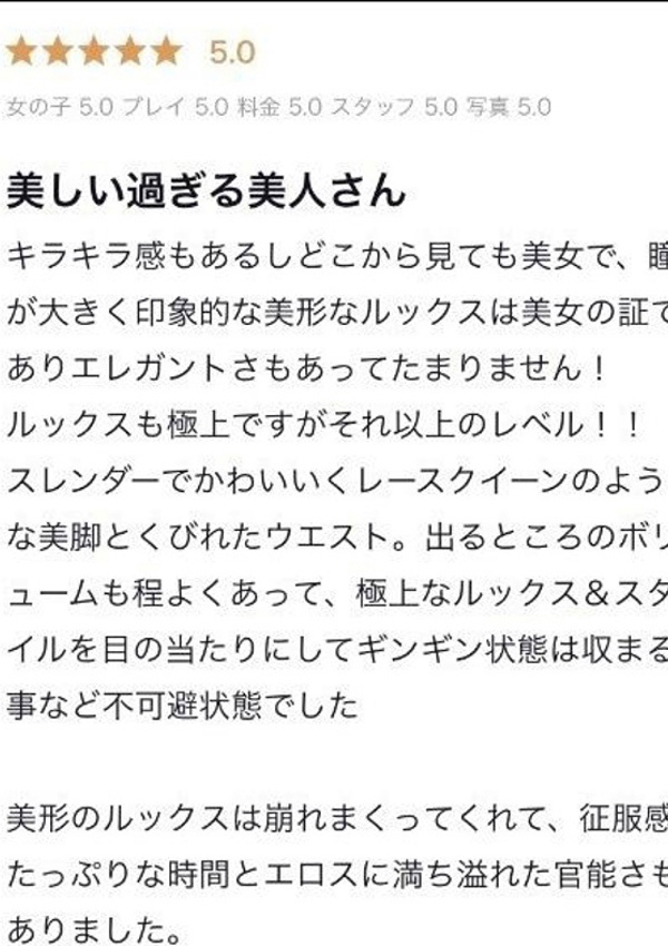 愛嬌たっぷり感度抜群綺麗系【みあ】さん♪繊細で知的な中にも癒しと優しさに満ち溢れ、透明度抜群の白い肌、非の打ち所がない女性特有の輝きを持った唯一無二のプロポーション♪均整を保ちながら女性らしい丸みを帯びたボディラインは素晴らしく、形良く張りのあるバスト、キュッと括れた流れるようなウエストライン、ボリューム感たっぷりのヒップ。眩しいばかりに輝くプラチナ美肌と相まって、貴方の心を虜にすることでしょう。お客様とのお二人の時間を濃密な一時を過ごして頂けること間違いないことでしょう。