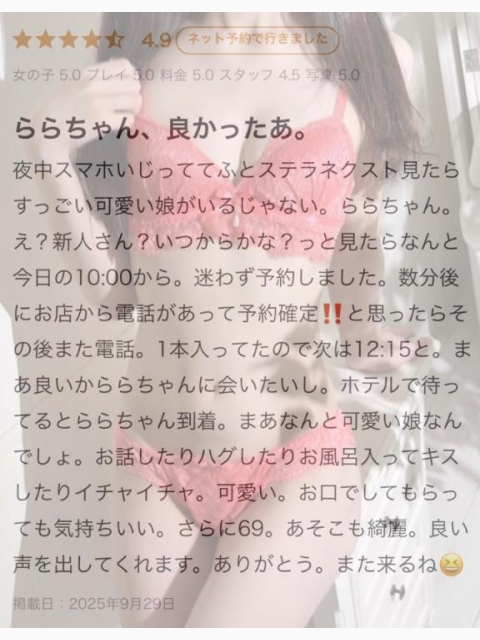 素敵な口コミありがとうございます✨️初日にありがとうございました🙇🏻♀️💖いっぱい撮影しましたね❣️やっぱりカメラ向けられるとめっちゃ緊張します😂一緒にシャワー浴びたり色んなシーンを撮影して頂いたりと普段では経験出来ないこと沢山しちゃいました(*^_^*)🎶また機会がありましたらお会い出来たら嬉しいです❣️お昼のお仕事もしてるので、なかなか平日とかは難しいですが😖貴重なお時間を私に使って下さりありがとうございました🙇🏻♀️🫶🏻らら