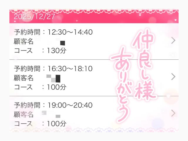 27日(土)19:00~100分で事前ご予約の本指名のN様ありがとうございます❤️早速ご予約いただけてとっても嬉しいです💓お会いできるのを楽しみにしていますね🥰27日(土)は14:40~16:30の枠のみ🈳なのでお遊びお考えのお兄様はお早めのご予約を☝🏻💗♡もえか♡