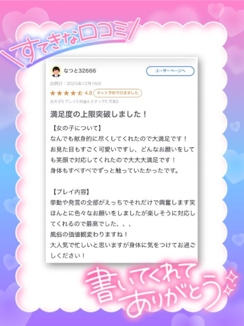 口コミありがとうございます❤️高評価にたくさんのお褒めのお言葉の数々嬉しい限りです🥰普段お昼の出勤はほぼしないのですが、オキニトークをいただき私もお会いしてみたいなぁと思い時間を調整させていただきました😊初めは緊張したものの、お話していくうちにお兄様の優しさを感じすぐに緊張が解けました😌💗そしてプレイではたくさん密着しながらお互いに気持ちよくなれて嬉しかったです🫶🏻💓おっぱいフェチのお兄様にたくさんおっぱいを堪能してもらえてよかったです♡とっても楽しいお時間でしたのでまたぜひお会いできたら嬉しいです🥰またのお誘いお待ちしておりますね❤️♡もえか♡