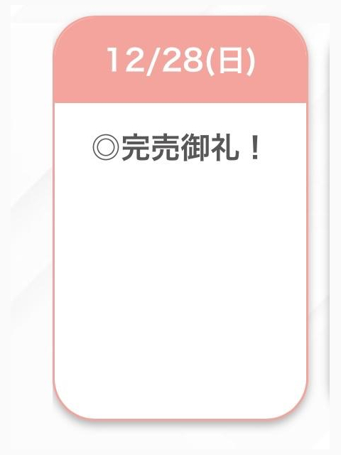 | 12/28(日) | 12/29(月) | 12/30(火) | 12/31(水) | 01/01(木) |