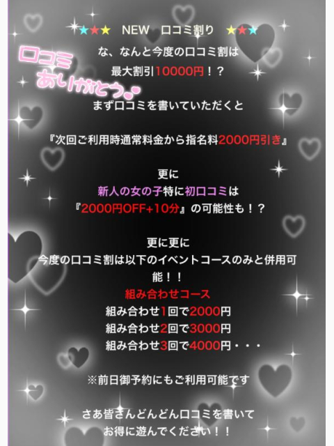 こんばんはっ🌙今日もお誘いありがとうございます♡ 最近口コミを書いてくださるお兄さんが増えて来たのでお得な情報を伝えちゃいますっ♡ ↓↓↓ 口コミを書いて下さったお兄さんは... 次回ご利用時通常料金から指名料2000円引きできちゃいますっ\(ˆoˆ )/2000円っておっきいよね❗️是非私と遊んだことあるお兄さんは口コミ書いてくれたら嬉しいなーって思います♡私の目標もあるので少しでも応援してくれたら嬉しいですっ🫶🏻詳しくはホームページチェックしてね☑️今日はまったりDayなのでいっぱい体力あり余ってるので遊んでくださいっ♡♡雫♡