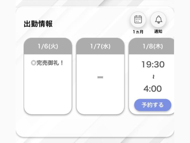 | 19:30〜04:00 | 要確認 | 要確認 | 要確認 | 要確認 |