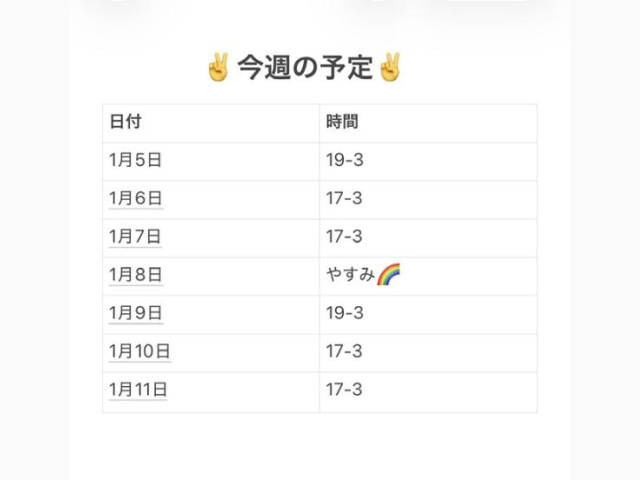 | 01/10(土) | 01/11(日) | 01/12(月) | 01/13(火) | 01/14(水) |
