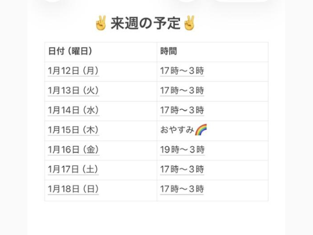 | 01/11(日) | 01/12(月) | 01/13(火) | 01/14(水) | 01/15(木) |