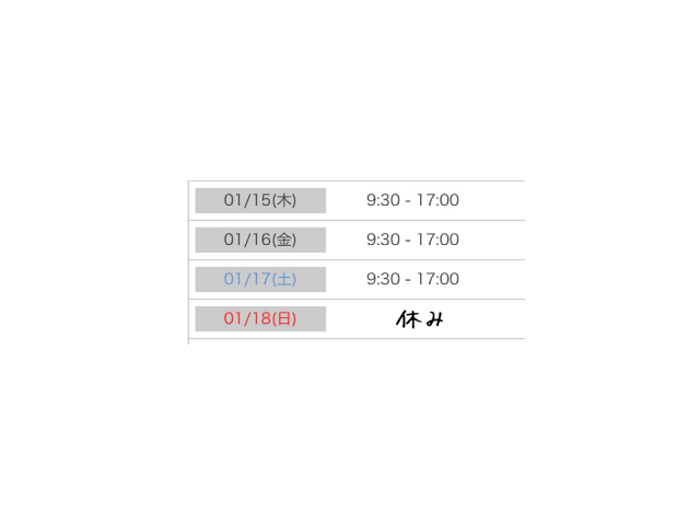 | 09:30〜17:00 | 要確認 | 要確認 | 要確認 | 要確認 |