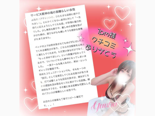口コミありがとうございます🫶 優しい雰囲気からのギャップでいじめられて性癖マッチングやばやばでした😭😭💞 お仕事のお話しも興味深くて終始楽しいあっという間の時間でした💭 また一緒に気持ちいい時間にしようね^⸝⸝𖦹 ·̫ 𖦹⸝⸝^-ゆうほ-