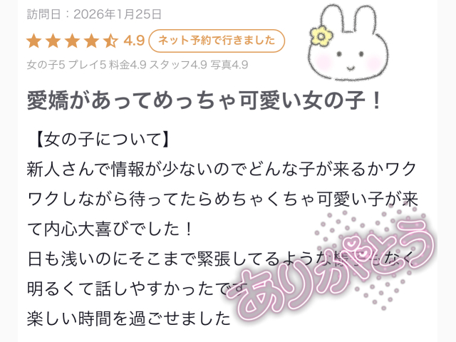 口コミ書いてくれたお兄さんありがとう꒰ᐡ֊ ‧̫ ֊ᐡ꒱💕💕記念すべき初の口コミだあ〜💭💭 いっぱい褒めて貰えて嬉しいです♩おともお兄さんのおかげで楽しい時間が過ごせましたよ🐶✨ 褒めて貰えたスタイルとか更に磨けるように頑張るよん- ̫ -💕 ありがとう♡おと🎵